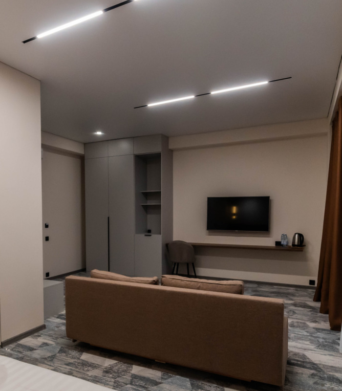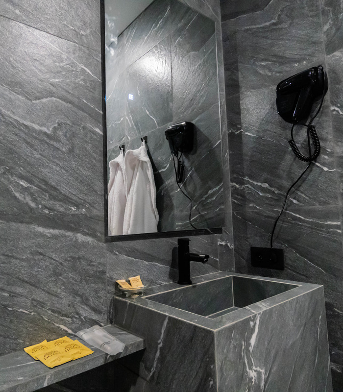 Площадь номера - 45 кв.м. 2 осн. места. 2 доп. места. Балкон. Мебель: вешалка, диван раскладной, зеркало, кресло-кровать, кровать двуспальная, прикроватные тумбочки, стол, стул, шкаф. Оборудование: кондиционер, телевизор, холодильник. Санузел: с душем, туалетные принадлежности, фен. Сервис: Wi-Fi бесплатно, смена полотенец, смена постельного белья, уборка номера.